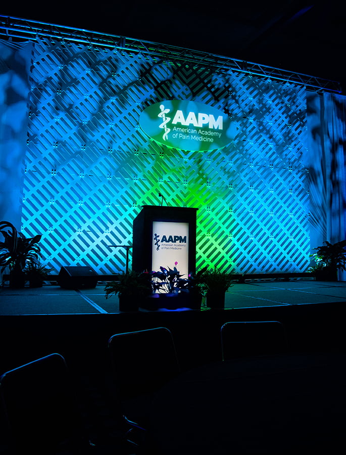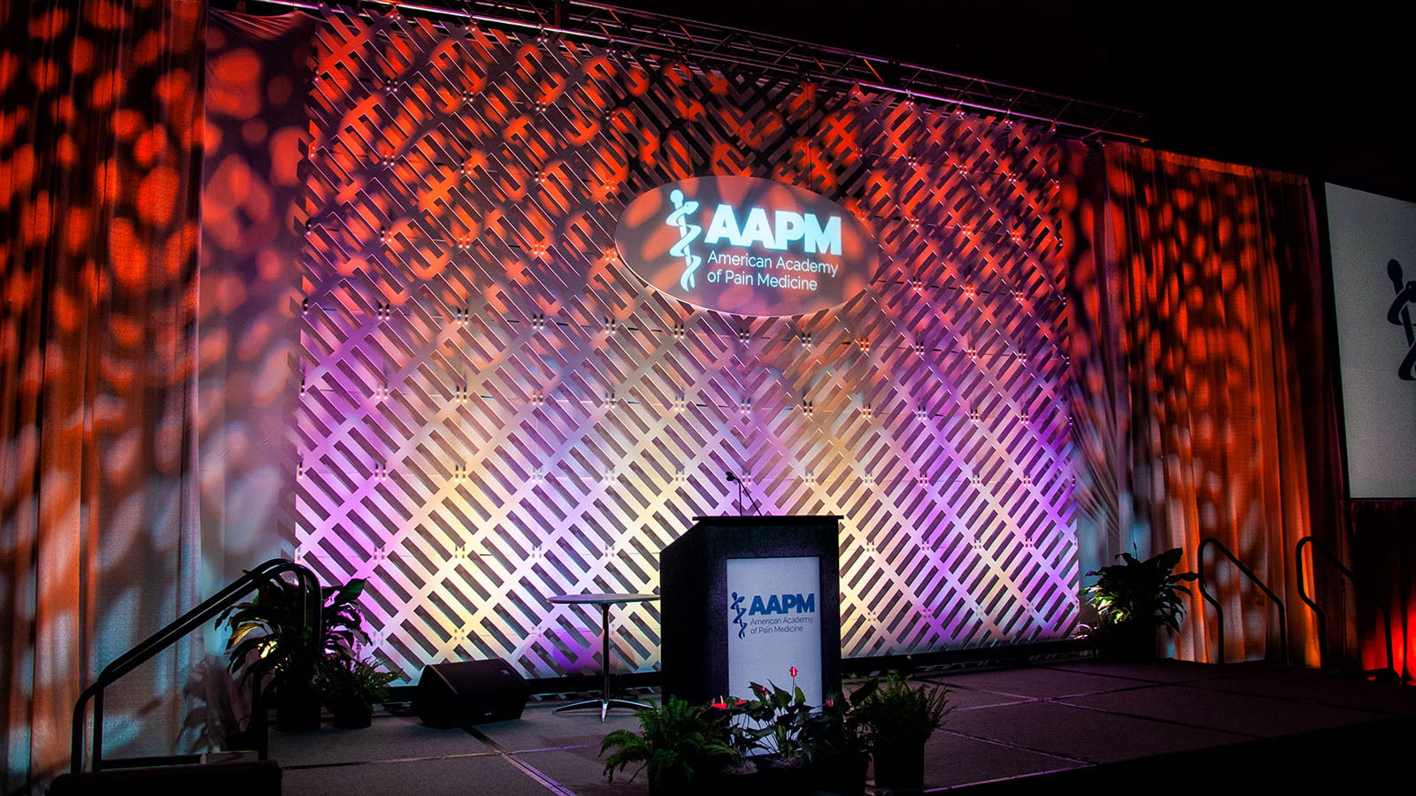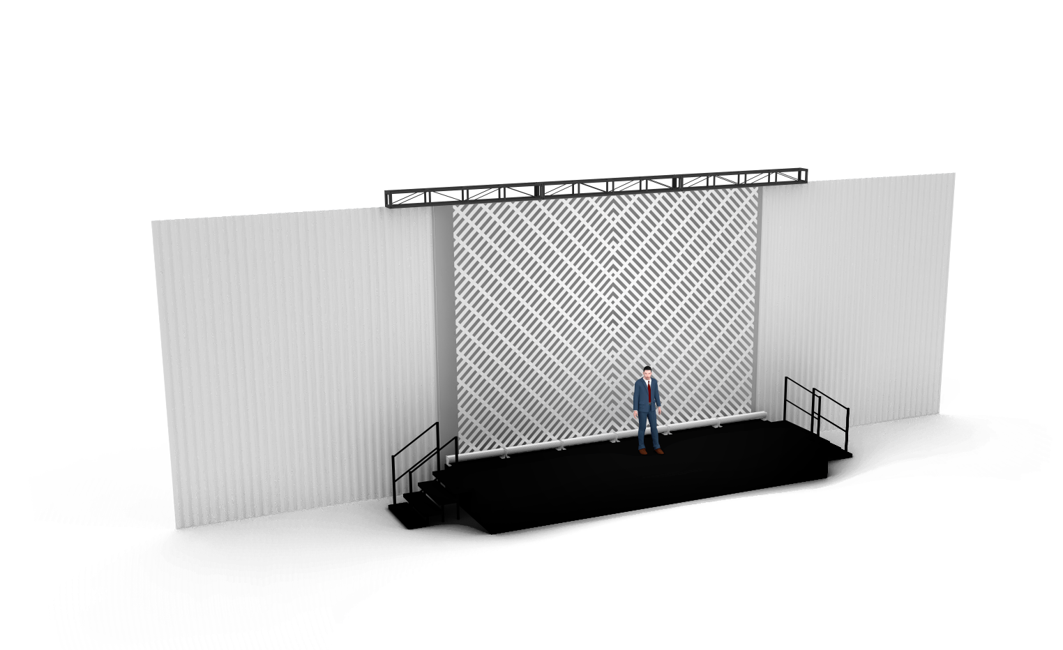 Flat panels constructed of thin strips form to create an illusion of a trellis wall. Brandable and suitable for colored lighting effects, this latticework design is ideal for the meeting that requires a simple orderly look and brand-able gobo options.